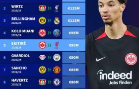 德甲转出费用排名:埃基蒂克9500万欧并列第4,前10多特法鹰各3人